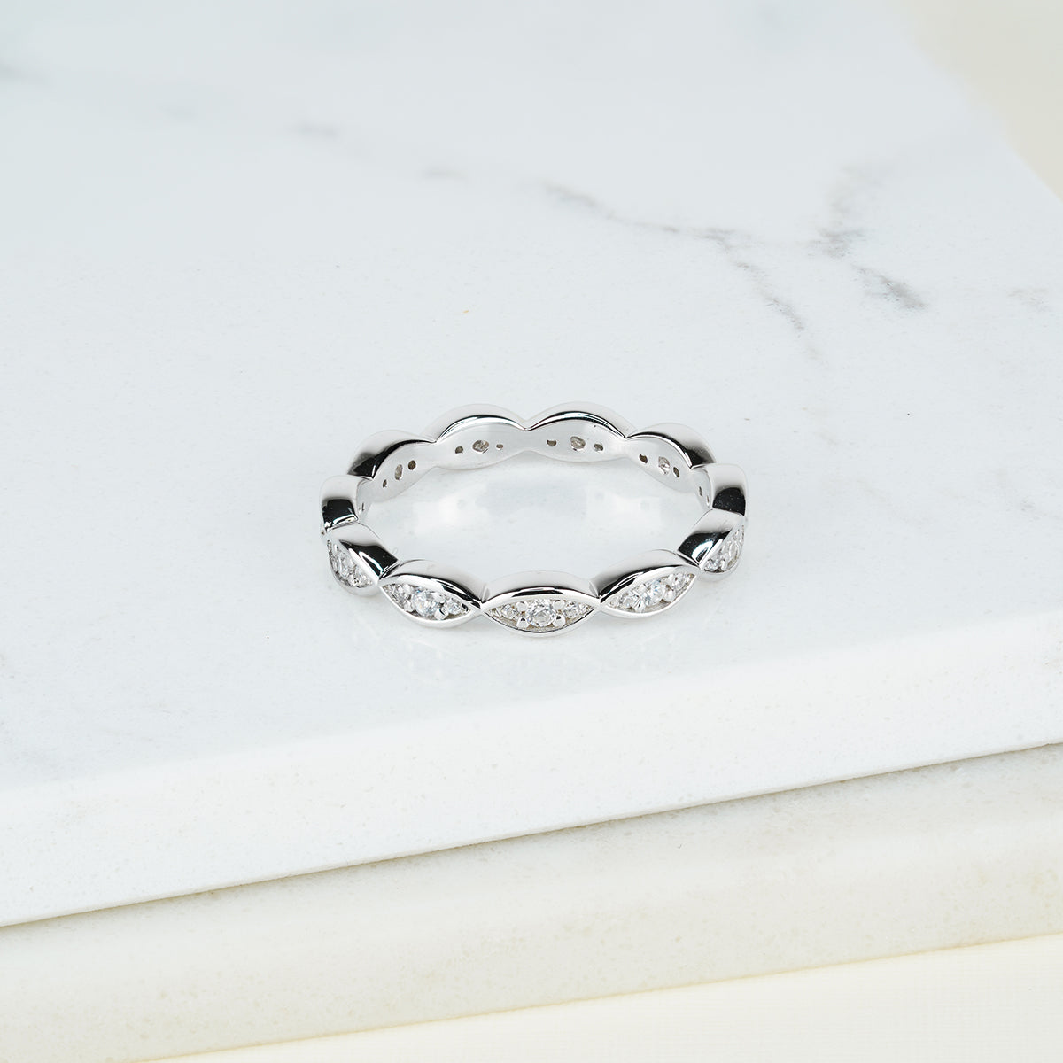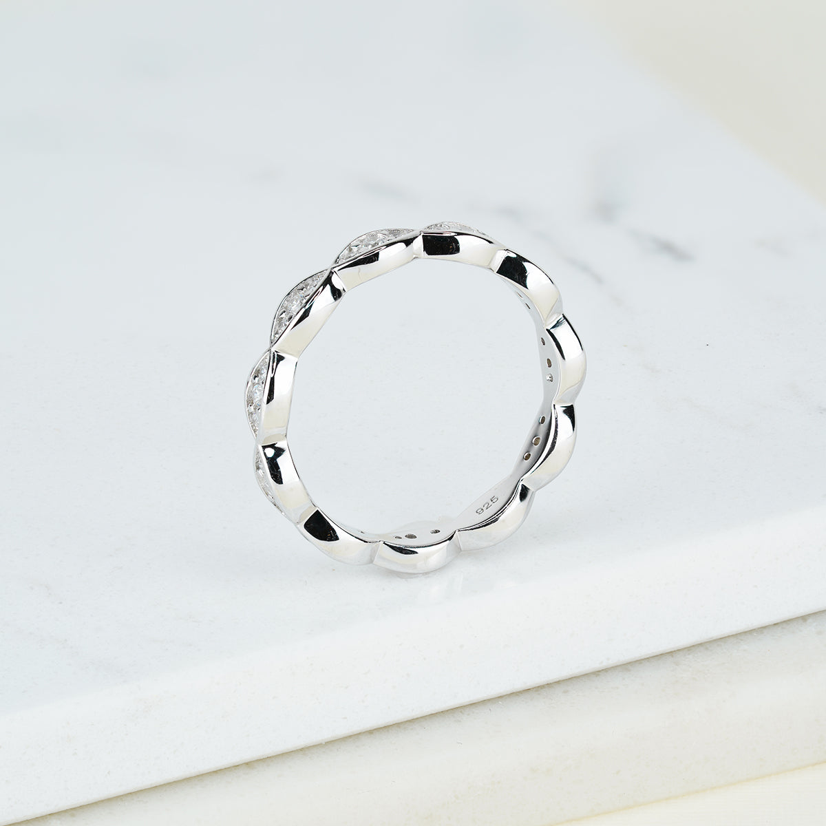 Delicate and elegant silver eternity band gracefully wraps around the finger, with its zirconia stones catching the light and sparkling from every angle.